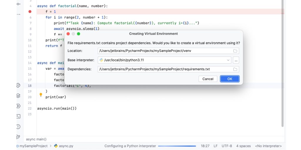 Best practice is to create a virtual environment to keep all the project dependencies isolated. PyCharm can create a virtual environment, or you can manually create it using the terminal.